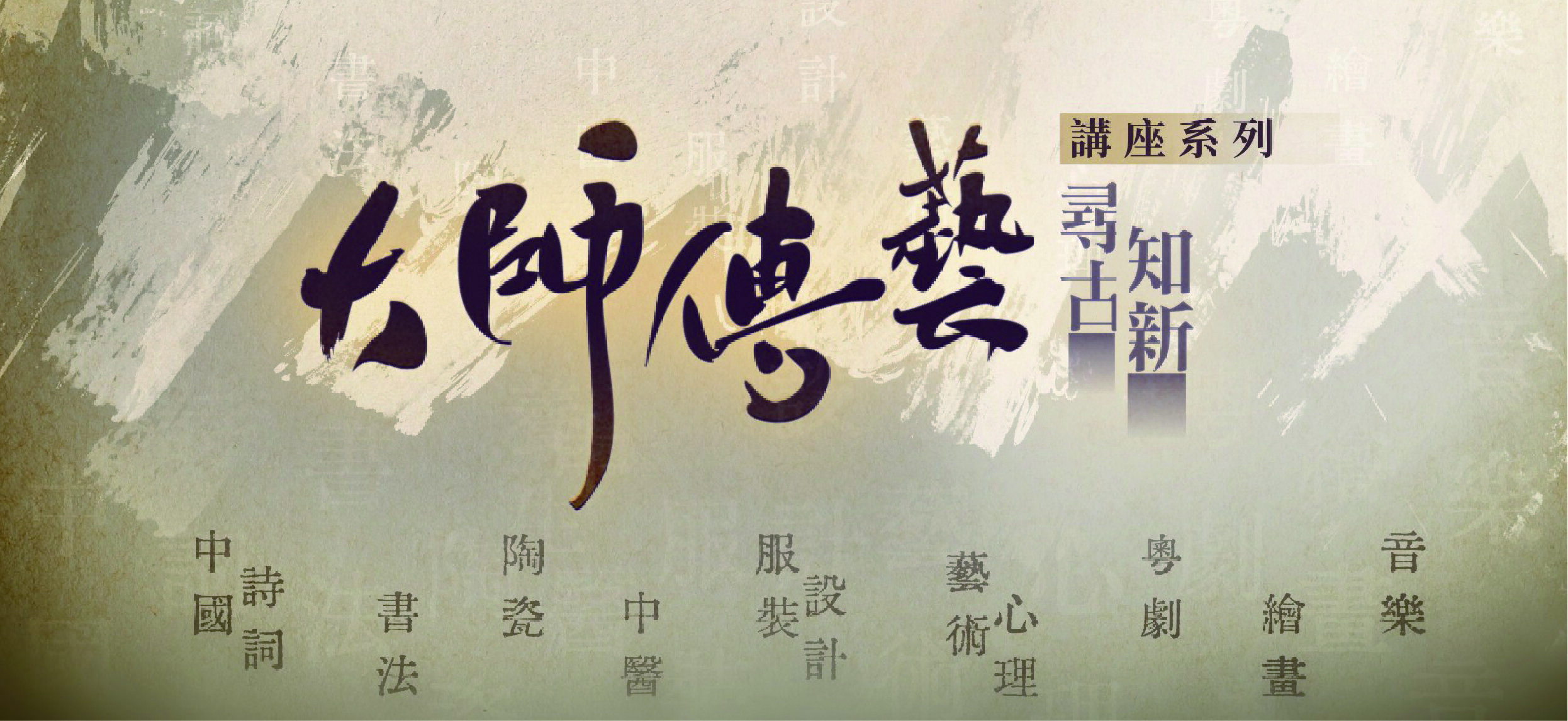《大師傳藝·尋古知新》為一系列共八節的藝術講座,邀約的講者皆為文化藝術領域的頂尖專家,內容結合傳統文化與現代藝術精神,主題涵蓋中國詩詞、書法、陶瓷、中醫、服裝設計、藝術心理、粵劇、繪畫及音樂等。活動另設陶瓷及中醫為主題的兩場工作坊,為參與者提供親身體驗的機會。本系列旨在推廣與傳承中國傳統文化,透過生動活潑的講解與互動實踐,鼓勵參與者學習、交流,貫徹實踐和傳承的理念。