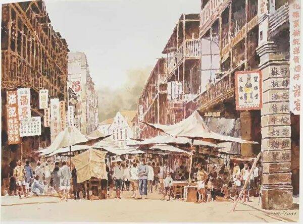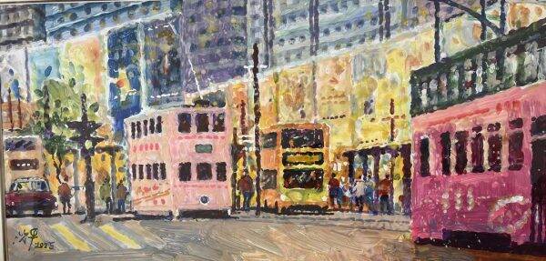 1980年来港定居后,沈平着迷描绘此地的风土人情,笔下常见铜锣湾海傍、湾仔旧区与上环的街道。近年虽受病痛挑战,迫使他改用左手绘画,两年间仍创作作品百余幅。画作色彩依旧鲜明,映照出画家对城市的热爱与旺盛的生命力。沈平的近作多选用丙烯颜料,笔触从过往的细腻转向简洁的点涂。色块在画布上流动、拼合,凑出一扇扇通往艺术家内心的彩窗。凝视其中,观者不仅能窥见画家丰沛的情感,更仿佛沉浸于他所见的那个绚烂世界。