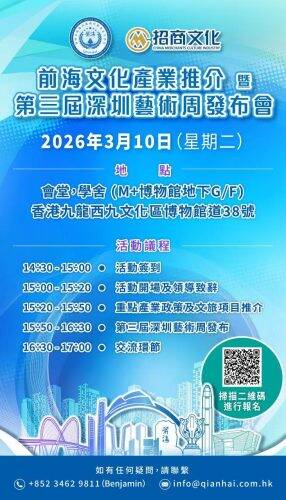 前海文化產業推介暨第三屆深圳藝術周發布會 下周M+博物館舉行 最新消息 2026年3月6日 「前海文化產業推介暨第三屆深圳藝術周發佈會」將於3月10日在M+博物館地下G/F學舍「會堂」舉行。活動將推介前海重點產業政策及文旅項目,並正式發佈第三屆深圳藝術周相關信息,為深港文化產業合作搭建溝通橋樑。活動免費開放予各界人士參與,掃描QR Code即可報名。